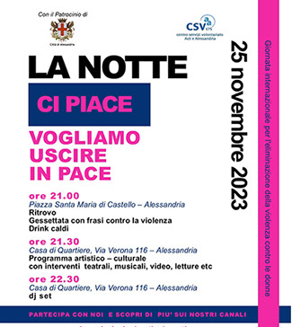 Dunque, appuntamento alle ore 21.00 di sabato 25 novembre in piazza S. Maria di Castello ad Alessandria, per un ritrovo con cartelli, striscioni e musica, poi si raggiungerà la Casa di Quartiere in via Verona, per una serata di letture, danze, canzoni, video e dj set fino alle ore 1.00, per sfidare la paura e per ridare voce alle donne. E quindi un invito: “Ci piacerebbe vedervi tutte lì. Portate con voi le vostre madri, nonne, sorelle, zie, nipoti e figlie”, dicono le organizzatrici “e cartelli, striscioni, bandiere che esprimano la propria affermazione di libertà e di vita”.