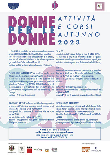 Dalla sinergia di diversi progetti (Effe, S.T.E.P., Donne x le donne) promossi dall’Associazione Don Angelo Campora odv e dall’APS Colibrì, è nato un programma per l’autunno 2023 di occasioni formative al femminile, che coinvolge le diverse generazioni, dalle aspiranti imprenditrici alle donne in cerca di lavoro, dalle casalinghe alle donne pensionate, dalle artigiane alle studentesse. “Donne per le donne” è una proposta formativa e di socializzazione aperta a tutte, con l’obiettivo di accrescere le competenze delle partecipanti per favorire la loro occupabilità e per promuovere l’inclusione sociale.