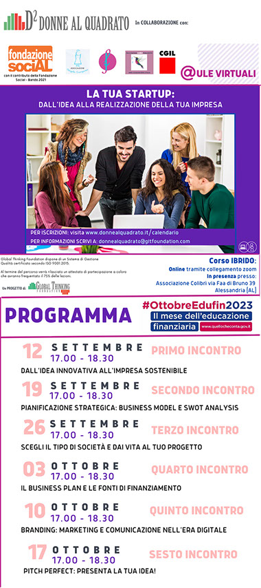 Il programma comprende: un corso online sull’autoimprenditorialità “La tua start up – dall’idea alla realizzazione della tua impresa” a cura di Donnealquadrato – Global Thinking Foundation, dal 12 settembre al 17 ottobre, tutti i martedì dalle ore 17.00 alle ore 18.30. Iscrizione gratuita: visita www.donnealquadrato.it/calendario