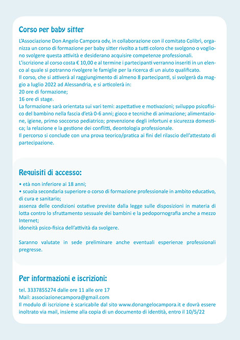 Al via le iscrizioni per il percorso di formazione per babysitter con docenti esperti e iscrizione all’albo del CISSACA, a cura dell'associazione Don Angelo Campora odv e dell’Aps Colibrì.